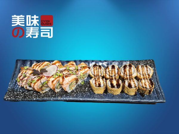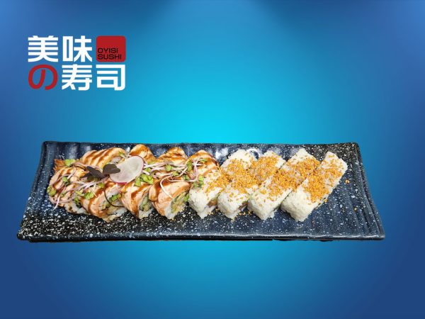 Toppet Uramaki: 8 stk. tempurarejer toppet med flamberet laks