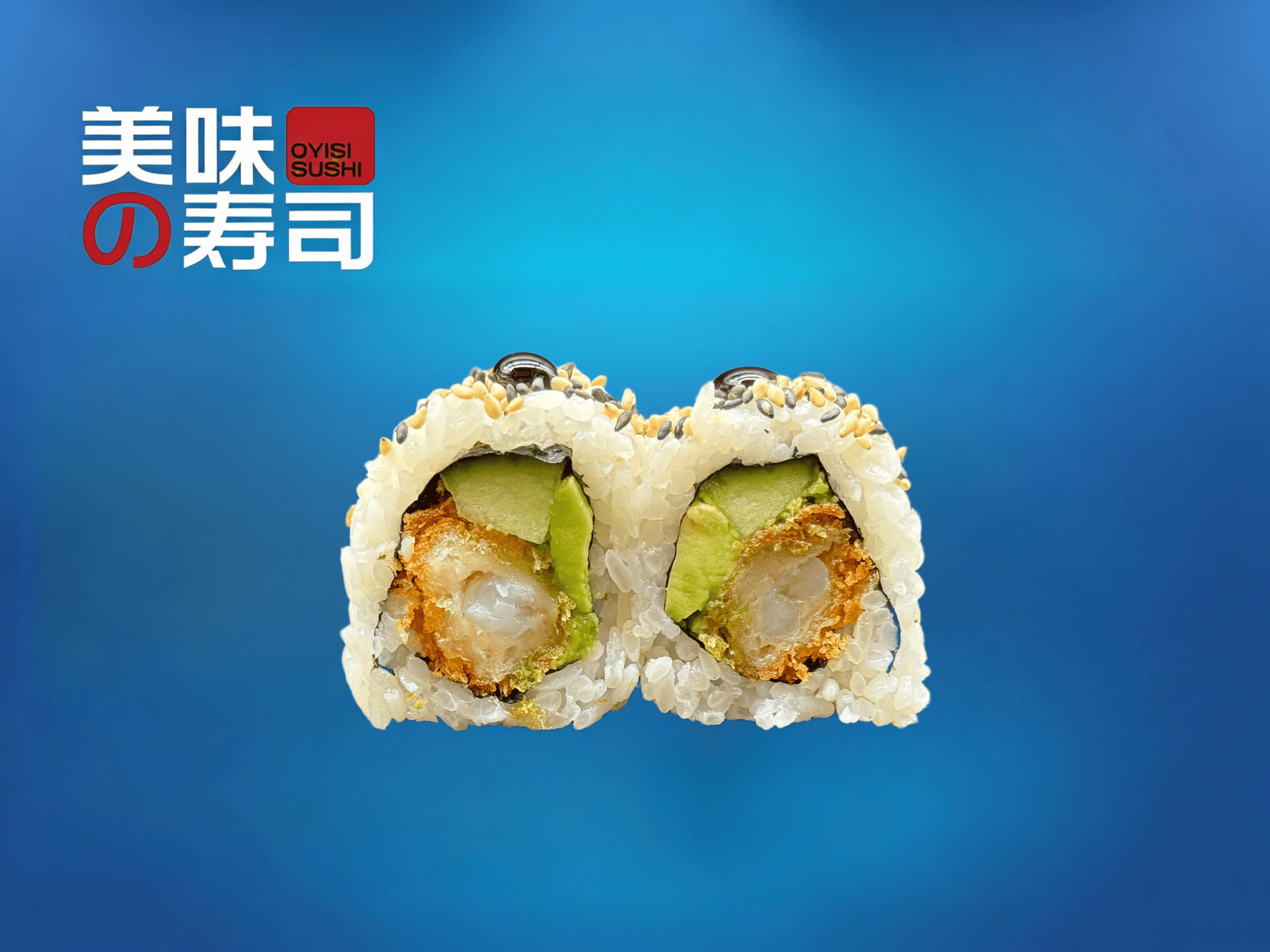 Tempura rejer, avocado og agurk, toppet med sesam og teriyaki sauce. 8 stk.