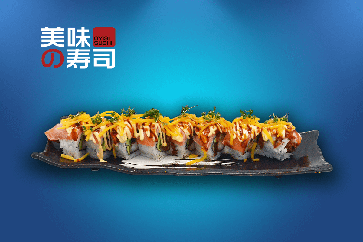 Dybstegt kylling, avocado, agurk, toppet med grillet laks.