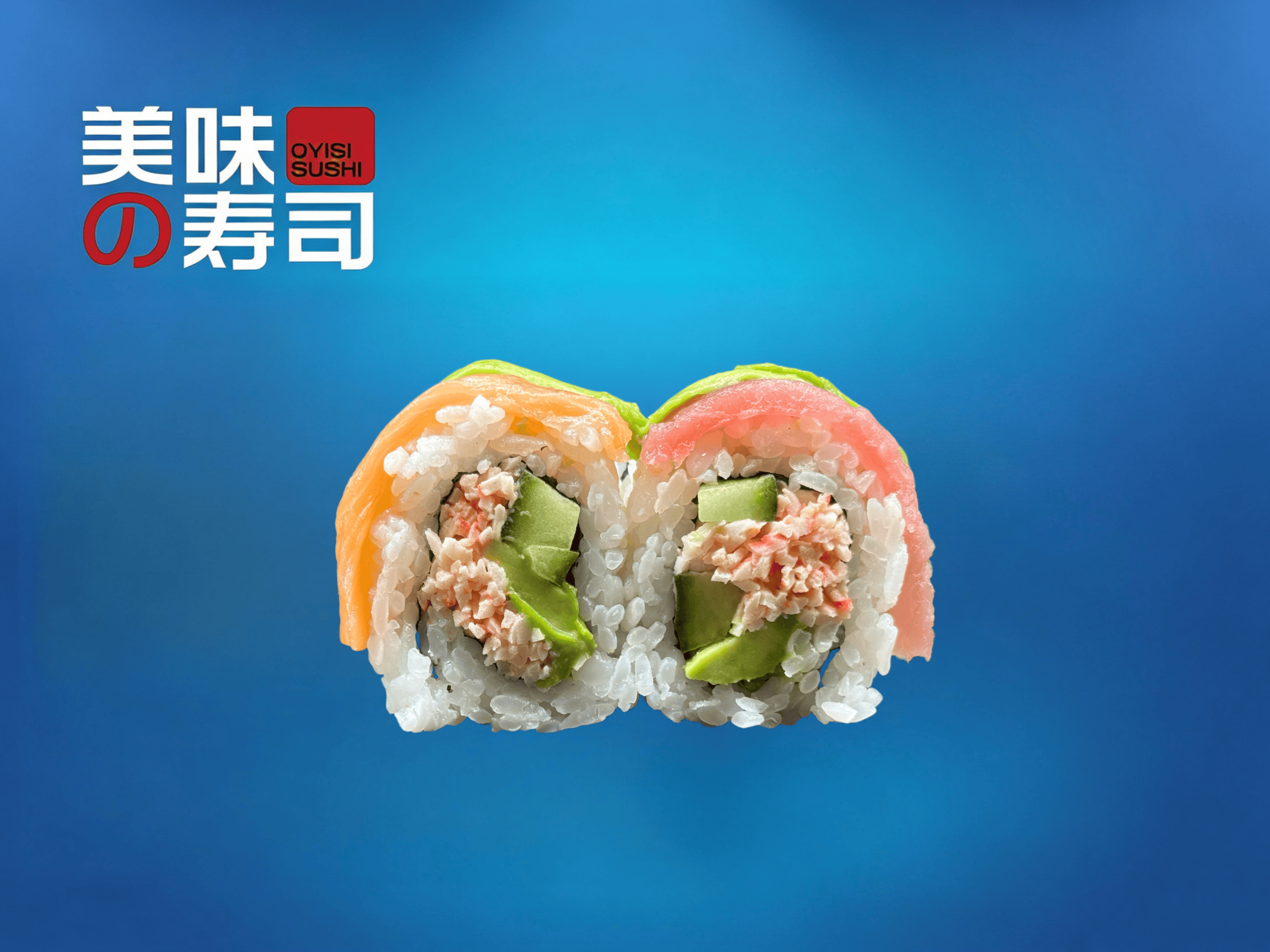 Surimi og chilimayo, agurk og avocado, toppet med laks, tun, rejer og avocado. 8 stk.