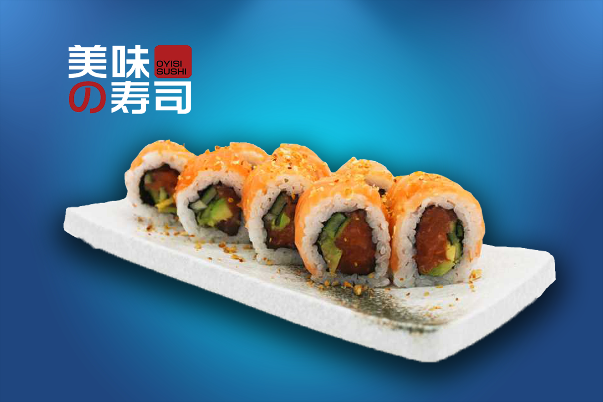 Laks, avocado, agurk, toppet med laks og hvidløg.