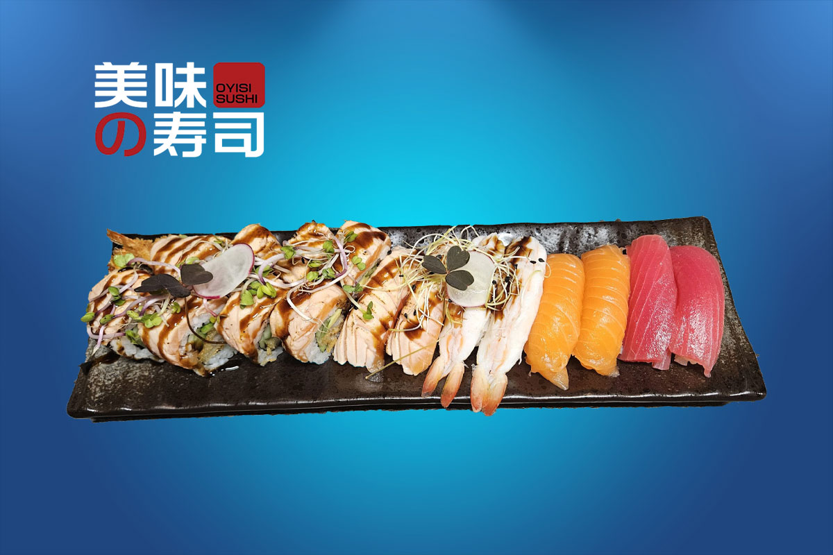 Nigiri: 2 stk. laks, 2 stk. tun, 2 stk. flamberet laks 2 stk,rejer