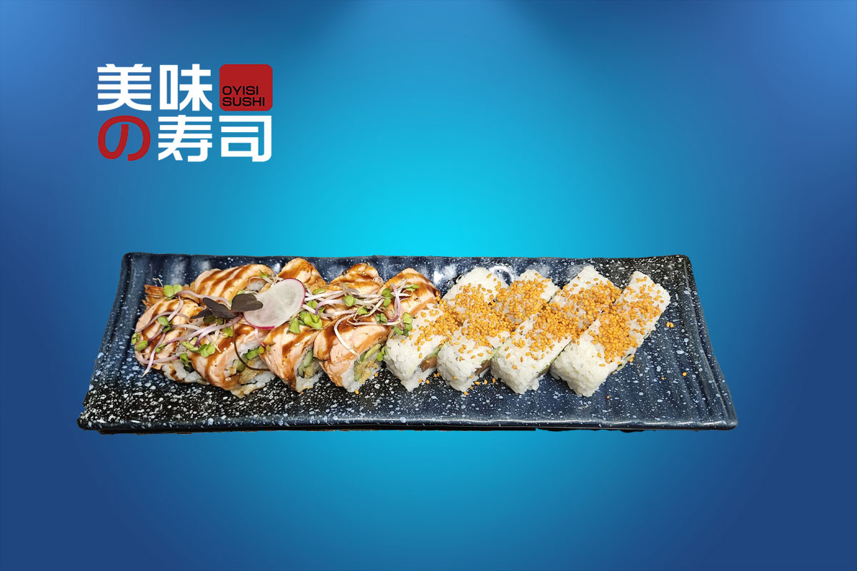 Toppet Uramaki: 8 stk. tempurarejer toppet med flamberet laks