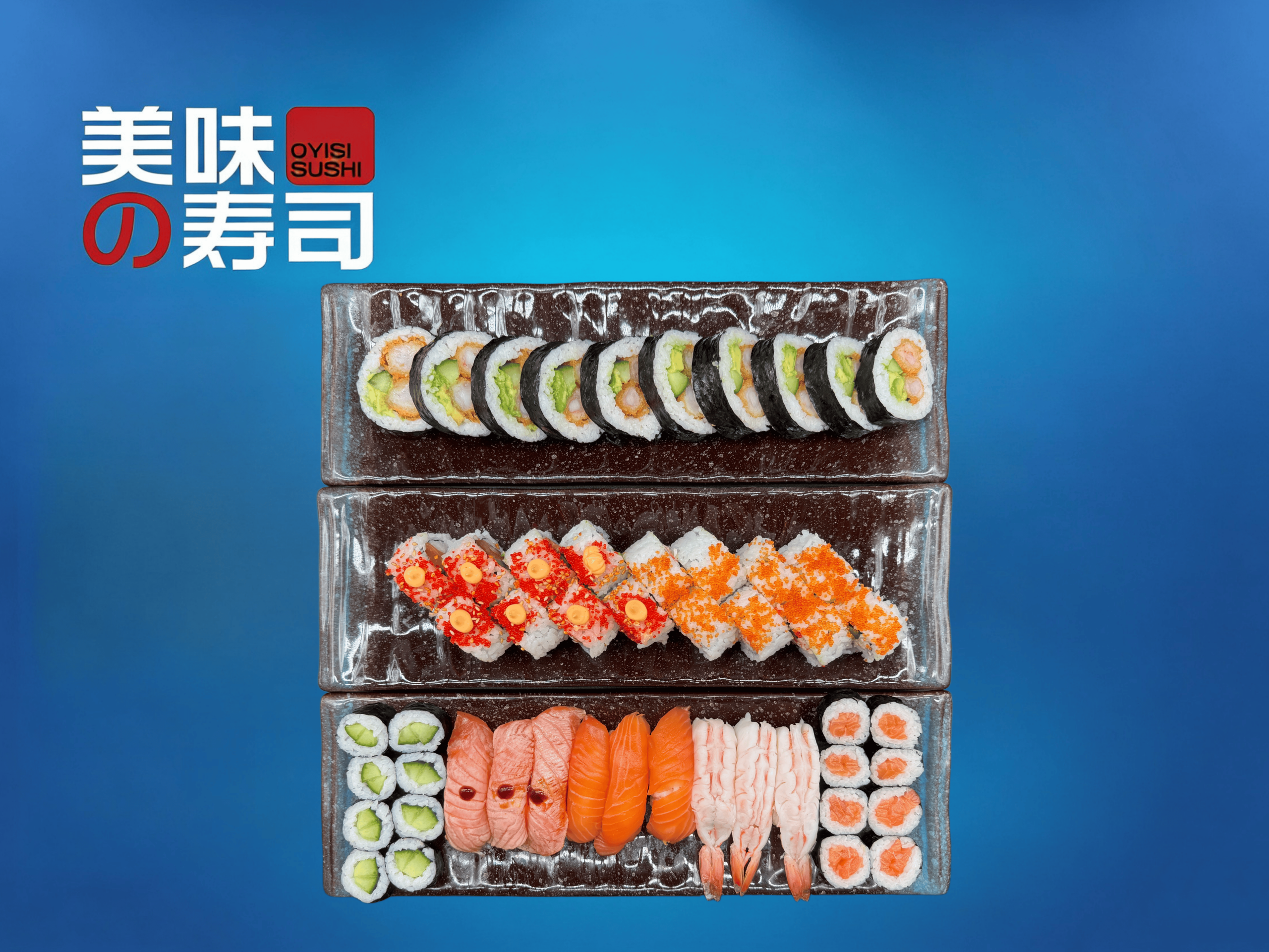 Toppet uramaki: 16 stk. tempurarejer toppet med grillet laks, 8 stk. tempurarejer toppet med avocado.